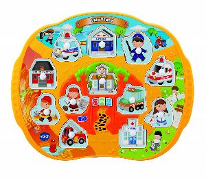 • Juego de piezas encajables electrónico basado en una ciudad. • El niño podrá visitar la ciudad conociendo algunas de sus profesiones, vehículos y edificios mientras encaja sus 12 piezas. • 3 actividades: - Explora y aprende: con cada pieza el niño aprenderá profesiones, nombres de los vehículos, etc. - Historias divertidas: combinando las diferentes piezas, escuchará historias geniales. - Hora de la música: 5 melodías y efectos sonoros propios de cada pieza. • 4 zonas de colores para ayudar al bebé en su aprendizaje.